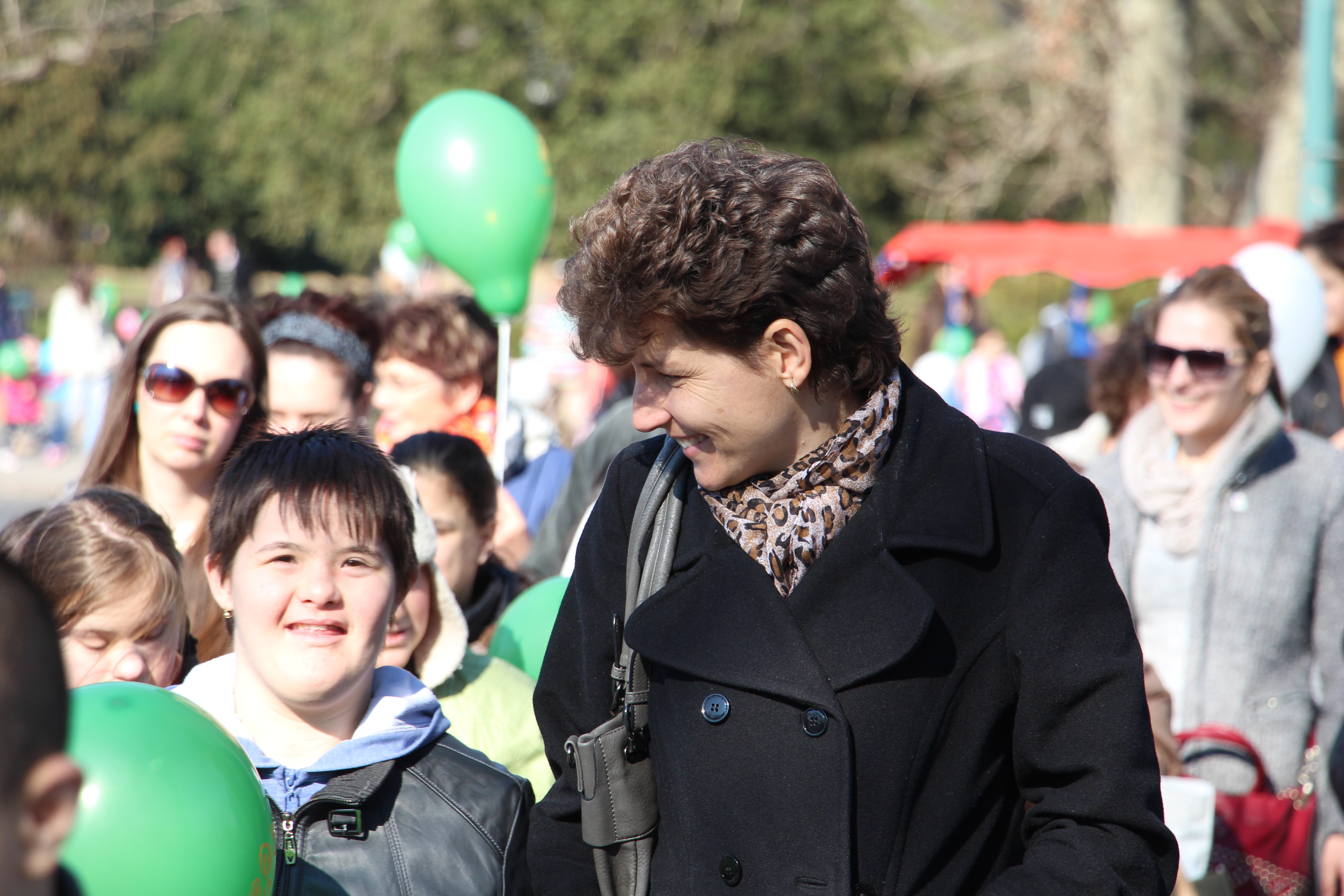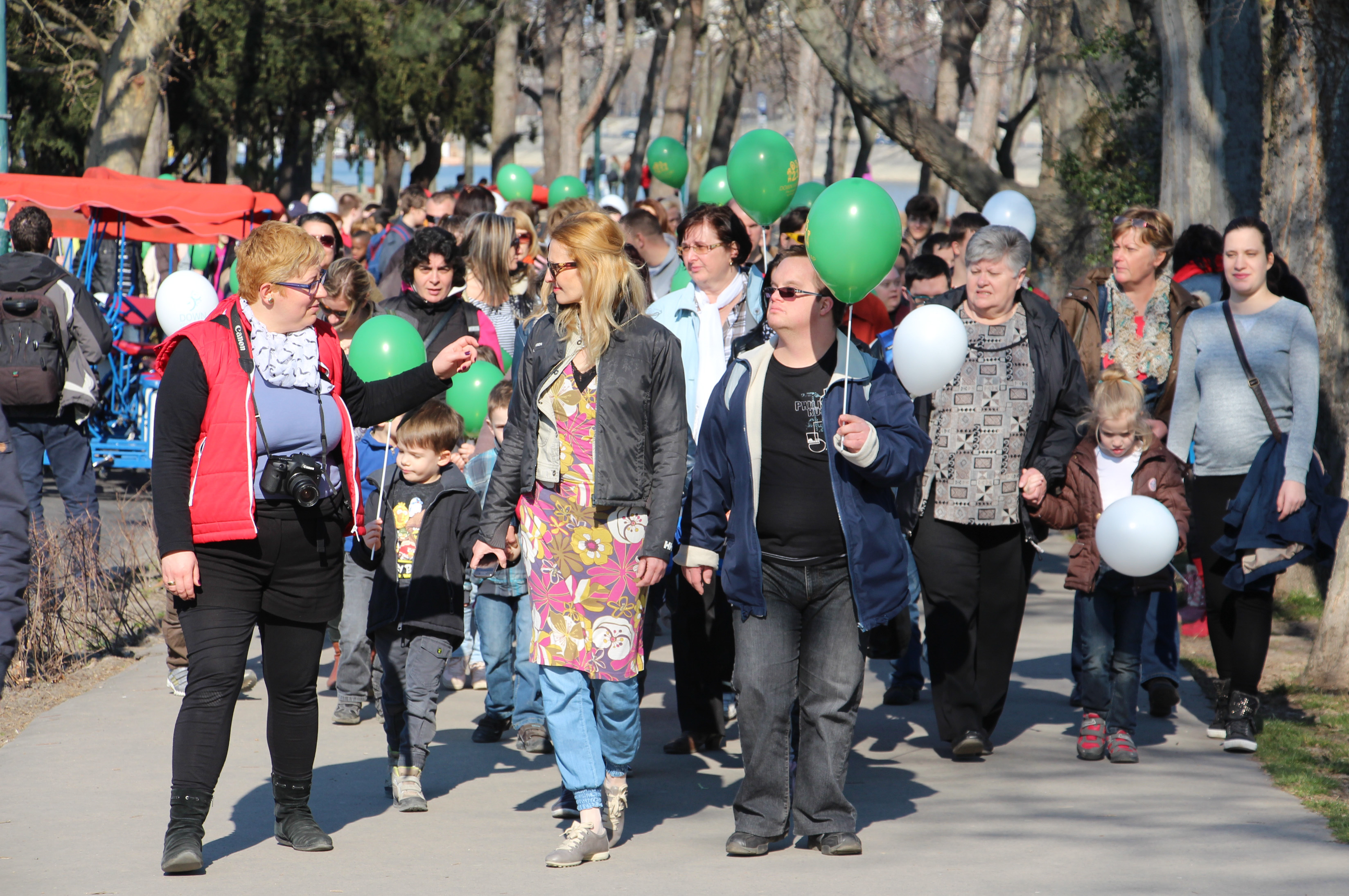 It's March 21st, World Down Syndrome Day. One in a thousand children are affected in utero, meaning Down syndrome babies may arrive to practically anyone's friends and relatives. Many people find children with disabilities difficult to approach, yet just like able children, they too can bring much joy, provided we are open toward them. In downtown Budapest, hundreds marched over Margit Bridge and gave a massive group hug to the theater building Vígszínház, to raise awareness for the power of joint action and care. By 2 PM a considerable crowd thronged the great fountain at Margaret Island. From kindergarten groups to elderly grandparents, hundreds showed up at Down Association's call on this sunny spring day. Organizers gave out white and green balloons to participants, and besides getting the crowd involved this gave way to some serious fun: whenever a balloon on a stick would pop, instead of freaking out the kids would wave their newfound magic wands.