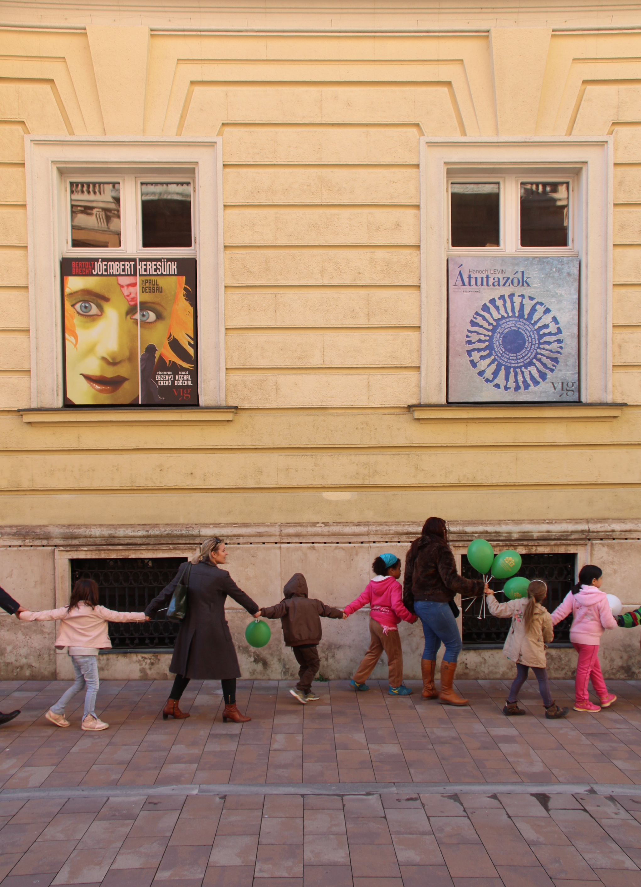 It was in this festive spirit that the crowd surged across Margaret Bridge toward Vígszínház, where Mr Gábor Gundel Takács orchestrated the group hug, with Downies, stroller pushers, kindergarteners and young people joining hands to embrace the theater walls. The living chain came momentarily undone on Ditrói Mór Street, but passers-by and participants quickly patched up the hain and offered their hands in expression of how joining together and accepting each other can indeed achieve absolutely anything.