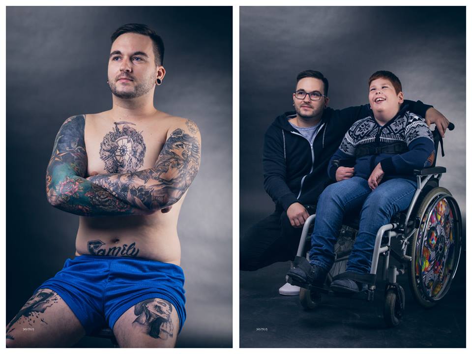 Fotó: Püspöki Zsolt" és a fotón ő látható (Gábor 27 „A tetovált” – Pintér Gábor, sérült gyerekekkel foglalkozó asszisztens, amatőr költő)