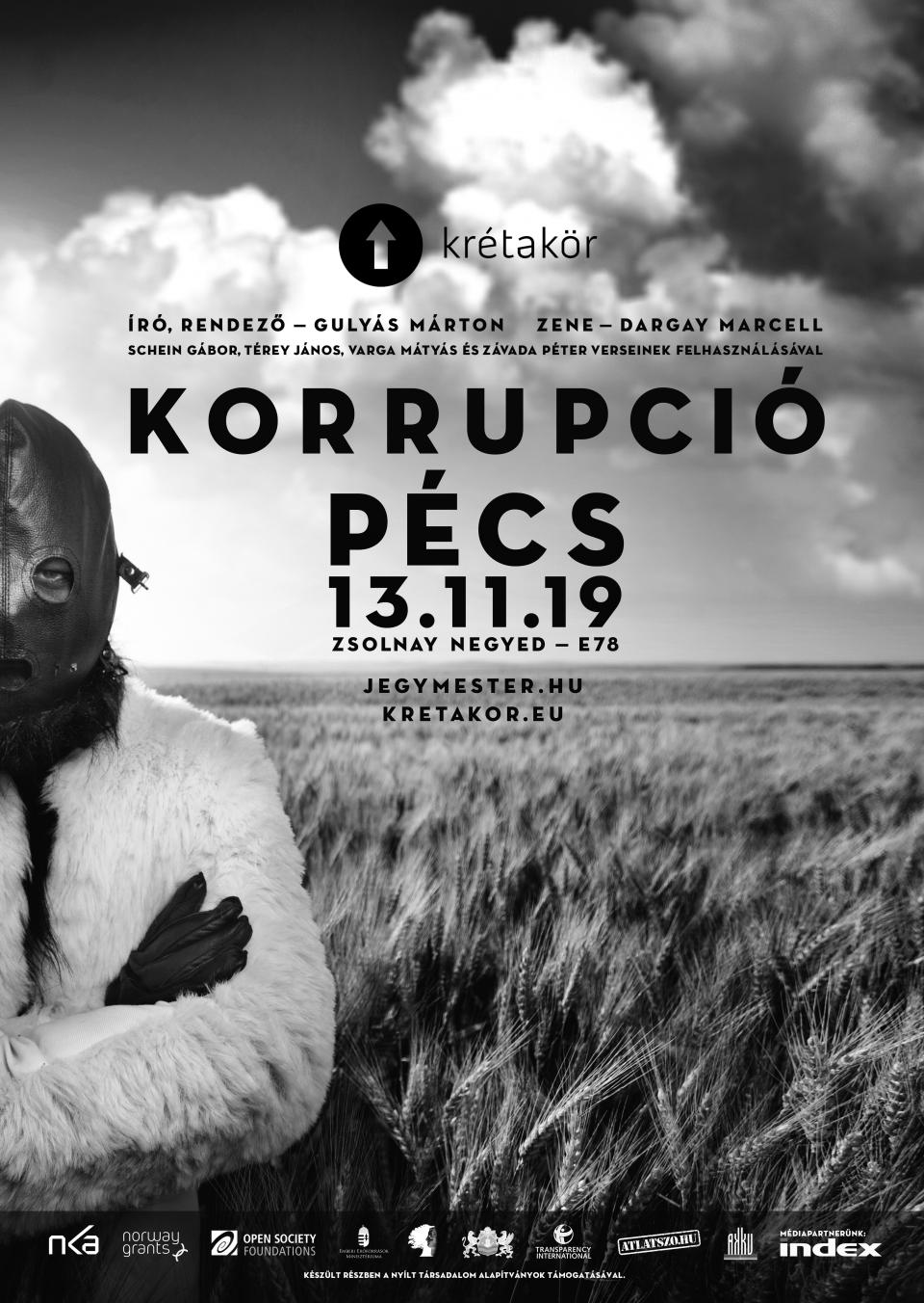 A Krétakör Korrupció című produkciója egy fiktív családi történetet bemutató színházi előadás, mely művészeti megközelítésben szól a korrupcióról, egy-egy valós botrányt elmesélve. A produkciót 2013-ban ötször játszották a fővárosban és egyszer külföldön (Poznan, Lengyelország.) A Korrupciót 2013-ban egy vidéki helyszínre, Pécsre sikerült eljuttatni. Az előadásnak a Zsolnay Negyed E78 nevű előadóterme adott otthont. A Korrupciót pótszékekkel kiegészített telt házas közönségnek játszhatták el. Partnerük, az átlátszó.hu egyik újságírója valamint a Transparency International vezetője részt vett a helyi érdeklődőkkel közösen tartott fórum beszélgetésen.